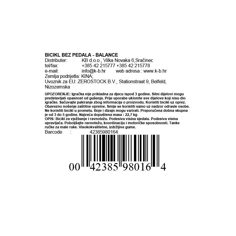 • Kočnice: model nema kočnice — dijete se zaustavlja nogama