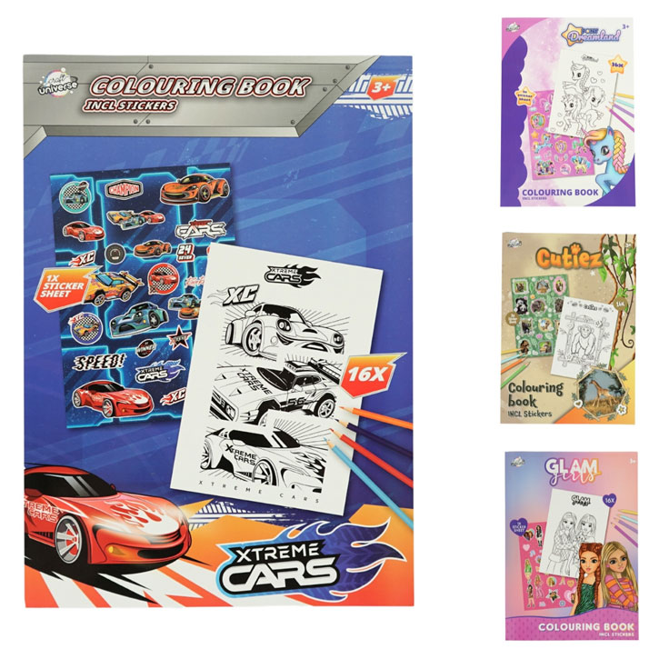 Bojanka u formatu A4 sadrži 16 stranica za bojanje i dolazi s dodatnim setom naljepnica koje djeca mogu koristiti za ukrašavanje stranica ili vlastitih radova. Dostupna je u različitim motivima – auti, životinje, jednorog i glam – što omogućava izbor prema interesima djece.