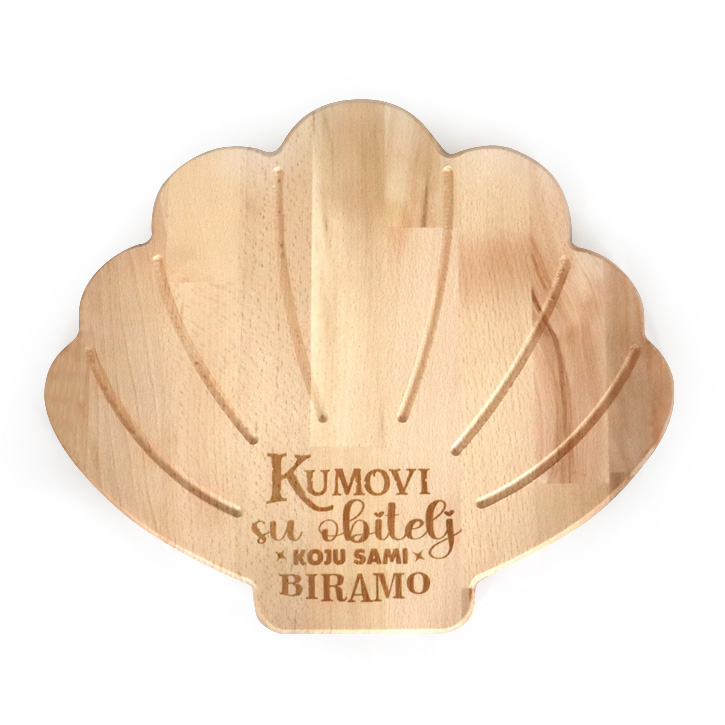 Poklonite svojim kumovima nešto posebno i jedinstveno – drvenu dasku za posluživanje u obliku školjke s gravurom „Kumovi su obitelj koju sami biramo“.