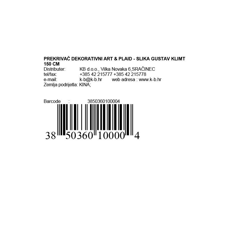 Prekrivač ukrasni je raskošan komad koji će dodati eleganciju i umjetnički šarm vašem domu. Ovaj prekrivač predstavlja predivnu reprodukciju slike poznatog umjetnika Gustava Klimta. Dimenzije prekrivača su 150 cm, što ga čini dovoljno velikim da ga možete koristiti kao ukras na kauču, krevetu ili fotelji. Izrađen je od kvalitetnih materijala koji osiguravaju dugotrajnost i mekoću.