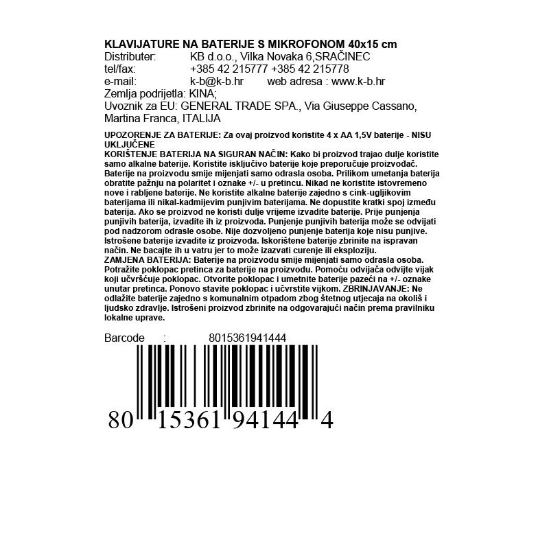 • Praktičnost: Dimenzije klavijature (40 x 15 cm) čine je lako prenosivom i pogodnom za pohranu, što omogućava djeci da je koriste bilo gdje – kod kuće, u parku ili na putovanju.