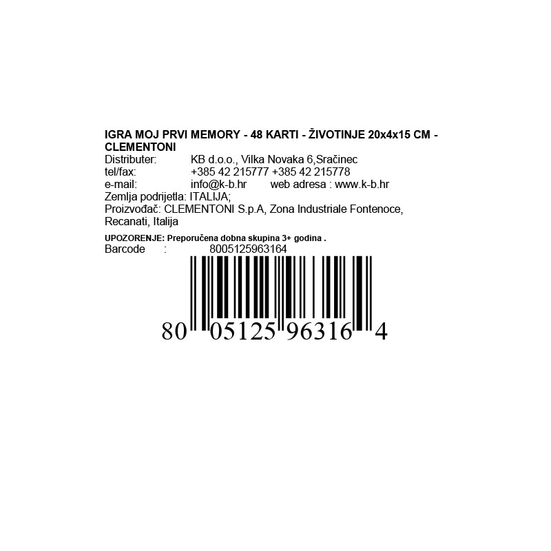 Društvena igra "Moj prvi Memory - 48 karti - Životinje" od proizvođača Clementoni prilagođena je najmlađim igračima kako bi im pružila zabavu i potaknula razvoj memorije i koncentracije.