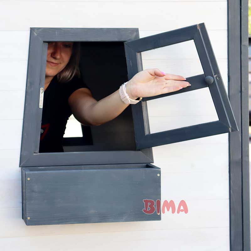 Ova pažljivo dizajnirana drvena kućica pruža ne samo prostor za igru, već i dodatne elemente koji potiču kreativnost i osjećaj za prostor.