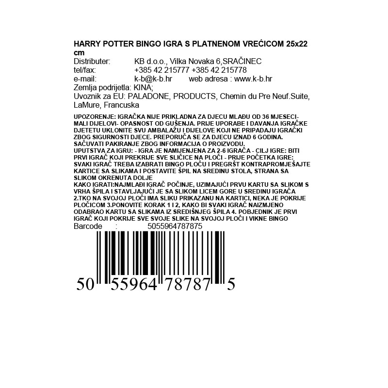 Zabavna igra za prijatelje i obitelji, ovaj set sadrži 6 bingo ploča, igraće karte, 120 zlatnih žetona za brojač Hogwarts grba i potpune upute koje se čuvaju u platnenoj torbi s uzicom.