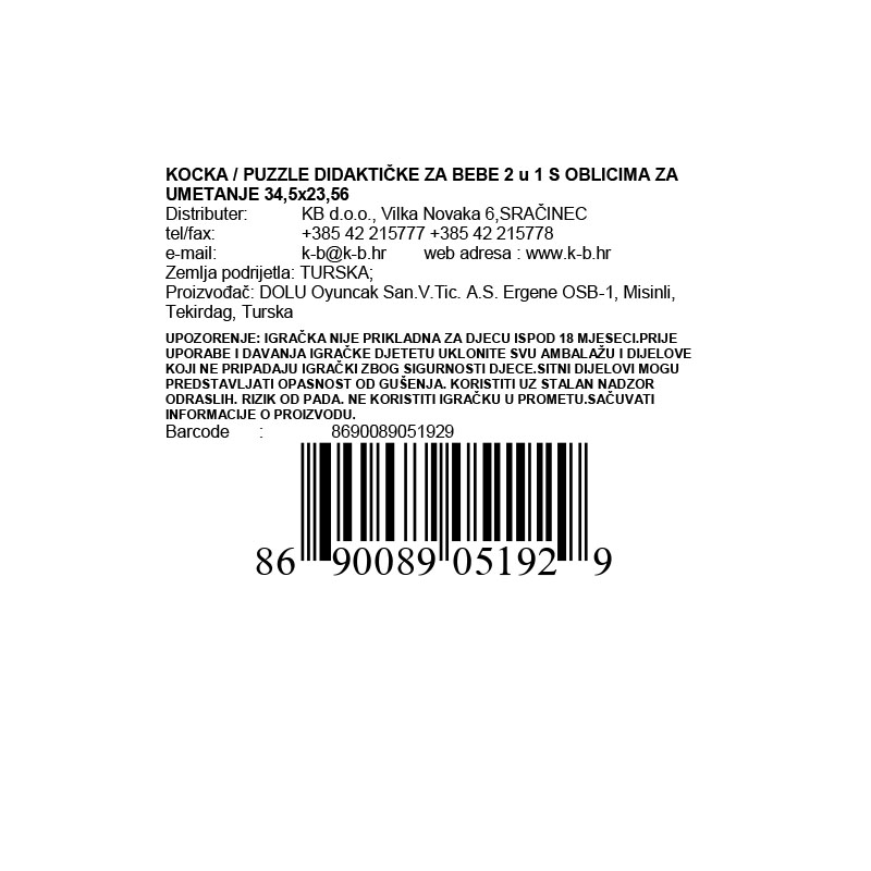 • Sigurnost i kvaliteta: Igračka je izrađena od sigurnih materijala što je važno za bebe koje često stavljaju igračke u usta. Kocka je dizajnirana tako da bude sigurna i izdržljiva za igru.