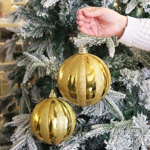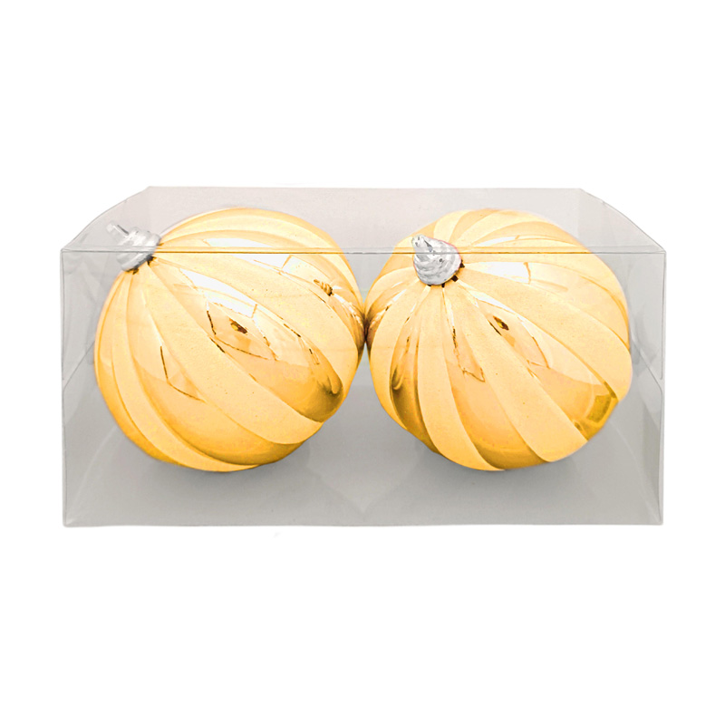 Set od dvije velike kugle za bor, promjera 15 cm, u zlatnoj boji s efektnim spiralnim dizajnom, pretvara svako drvce u istinsku blagdansku atrakciju. Sjajna površina i zlatni tonovi reflektiraju svjetlost i stvaraju bogat, luksuzan dojam, unoseći toplinu i eleganciju u prostor.