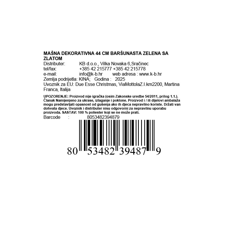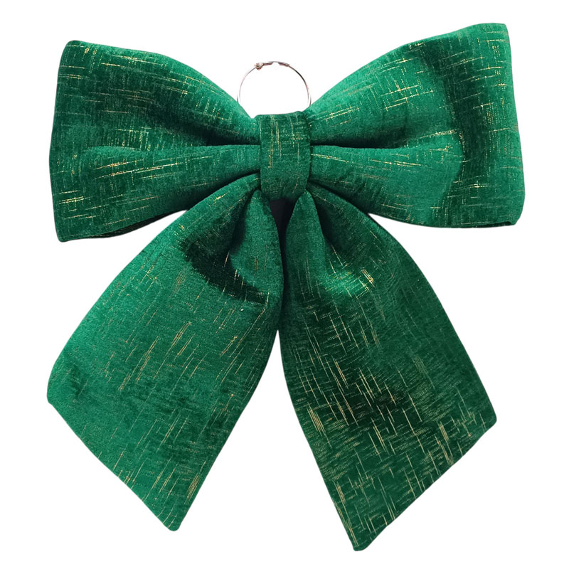 Baršunasta ukrasna mašna dimenzije 44 cm u zelenoj boji sa zlatnim nijansama unosi eleganciju i svježinu u svaki blagdanski ambijent. Luksuzna tekstura i decentni zlatni uzorci stvaraju dojam raskošnog blagdana, dok praktični metalni držač olakšava pričvršćivanje na bor, vrata ili prozor.