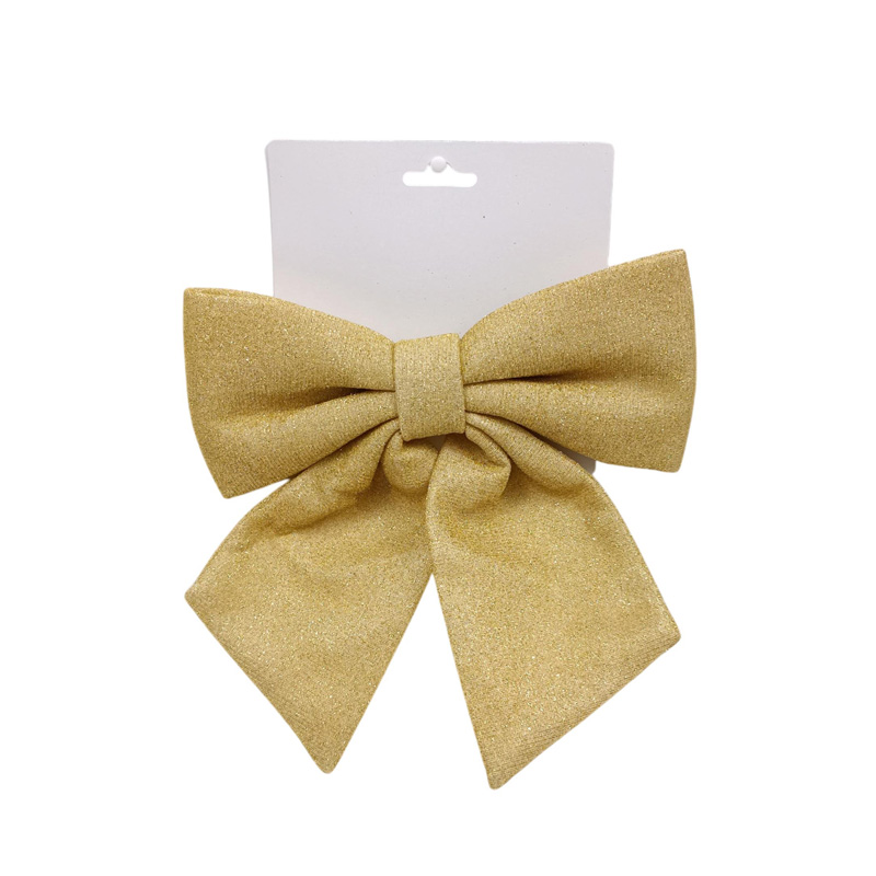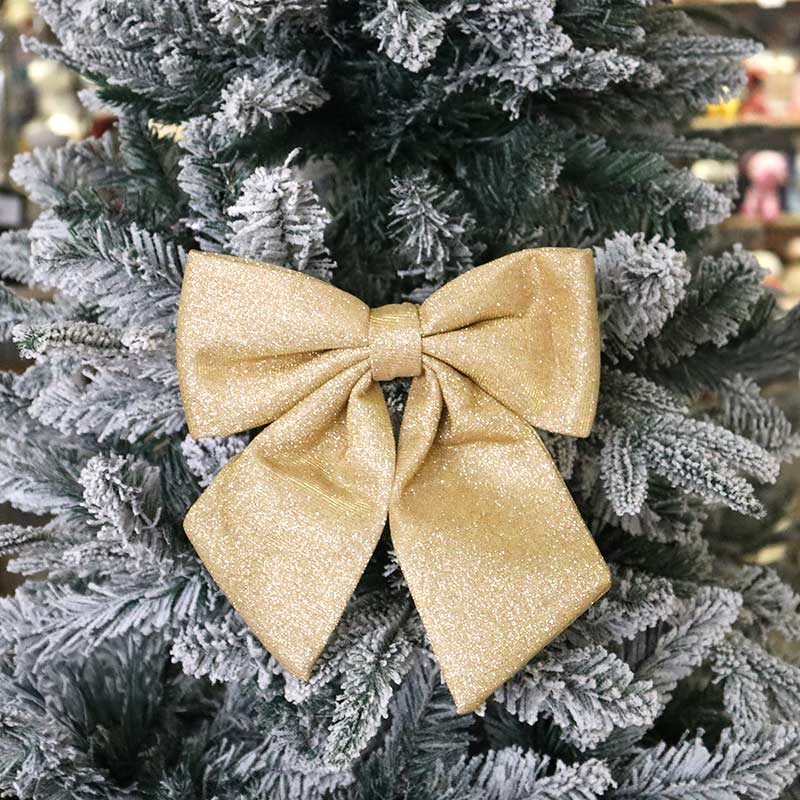 Dekorativna mašna dimenzije 22 cm u raskošnoj zlatnoj boji sa šljokicama spoj je modernog glamura i klasične svečanosti. Sjajna površina reflektira lampice i lampione, podiže svaki aranžman te ga čini vizualno bogatijim i toplijim.