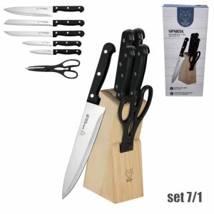 Ovaj 7-dijelni set noževa i škara SPARTA savršen je izbor za svaku kuhinju. Kombinacija visokokvalitetnih noževa i praktičnih kuhinjskih škara osigurava precizno rezanje svih vrsta namirnica, dok drveni stalak omogućuje uredno i sigurno skladištenje.