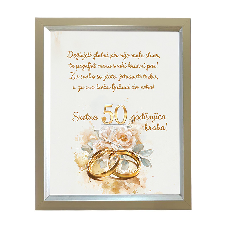 Poklonite trenutak za pamćenje – ovaj okvir sa natpisom ističe značaj zlatnog pira, poziva na razmišljanje o zajedničkim trenucima, ljubavi i žrtvi koje vode do neponovljivih 50 godina života u dvoje. Stihovi su nježno pozlaćeni i uravnoteženi s motivom prstenova, simbolizirajući trajnost i uzajamno poštovanje.
