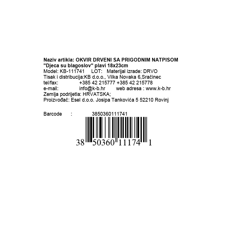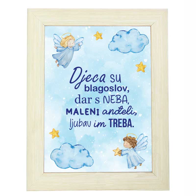 Okvir s natpisom "Djeca su blagoslov" savršen je način da izrazite koliko su djeca dragocjena i koliko obogaćuju život. Plava boja simbolizira mir, povjerenje i ljubav, te je idealna za dječje sobe ili kao poklon za roditelje, obitelj i prijatelje koji su primili najljepši dar – dijete.