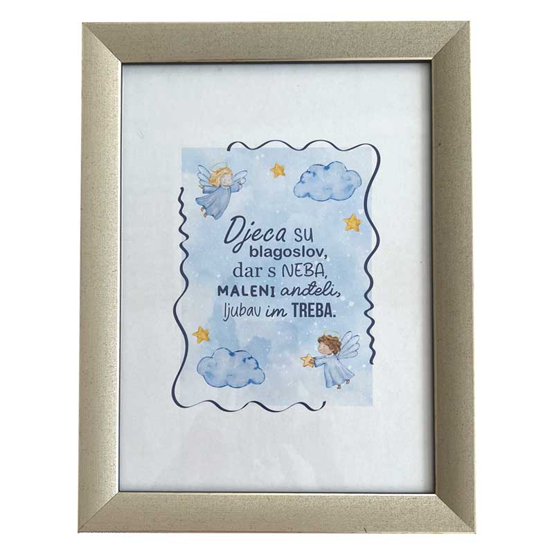 Natpis "Djeca su blagoslov" nosi duboko emotivno značenje. On nas podsjeća na čistoću, nevino srce i neizmjernu radost koju djeca donose u naše živote. Ovaj okvir nije samo dekoracija, već je i simbol ljubavi, nade i blagoslova koje djeca predstavljaju.