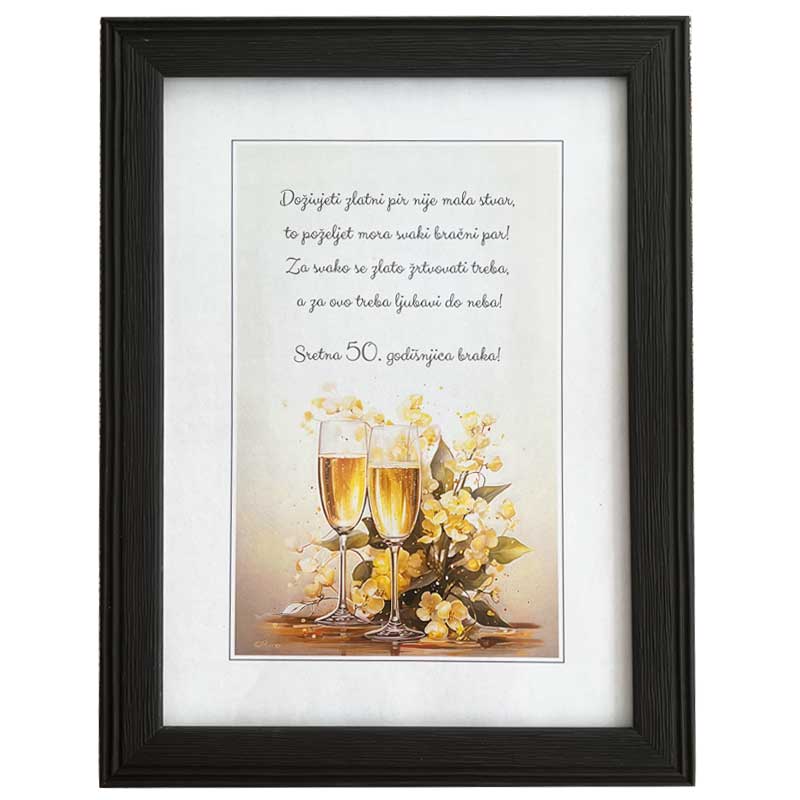 Natpis "Sretna 50. godišnjica" nosi sa sobom sve najbolje želje za još mnogo godina ispunjenih srećom i zajedničkim trenucima. Svaki pogled na ovaj okvir vraća u sjećanje dragocjene trenutke i ispunjava srce toplinom.