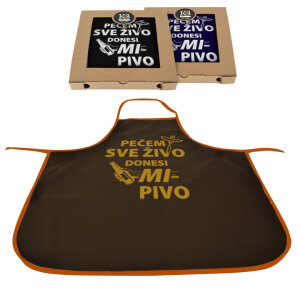 Pregača s šaljivim natpisom: "Pečem sve živo donesi mi pivo"