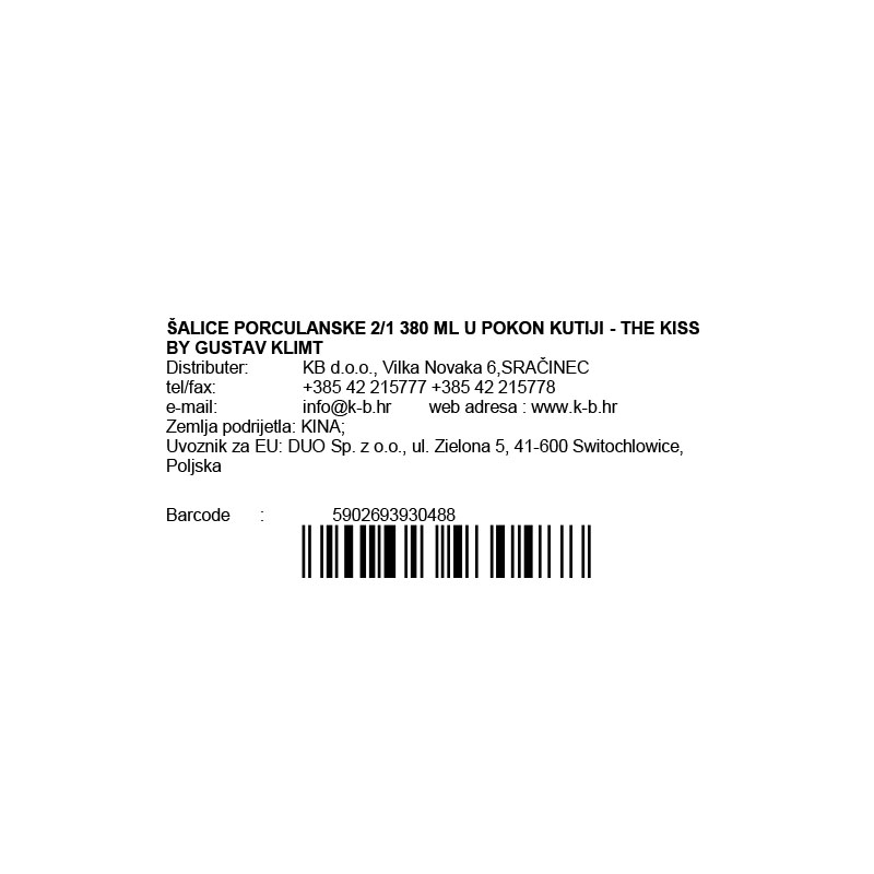 Set od 2 porculanske šalice zapremnine 380 ml s motivom slike "Poljubac" autora Gustava Klimta. Izrađeno od porculana kojeg karakterizira prirodna krem-bijela boja s nježnim odsjajem te iznimna čvrstoća i postojanost, uz zadržavanje lakoće i finoće.