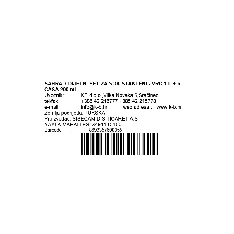 SAHRA 7 DIJELNI SET ZA SOK STAKLENI - VRČ 1 L + 6 ČAŠA 200 mL