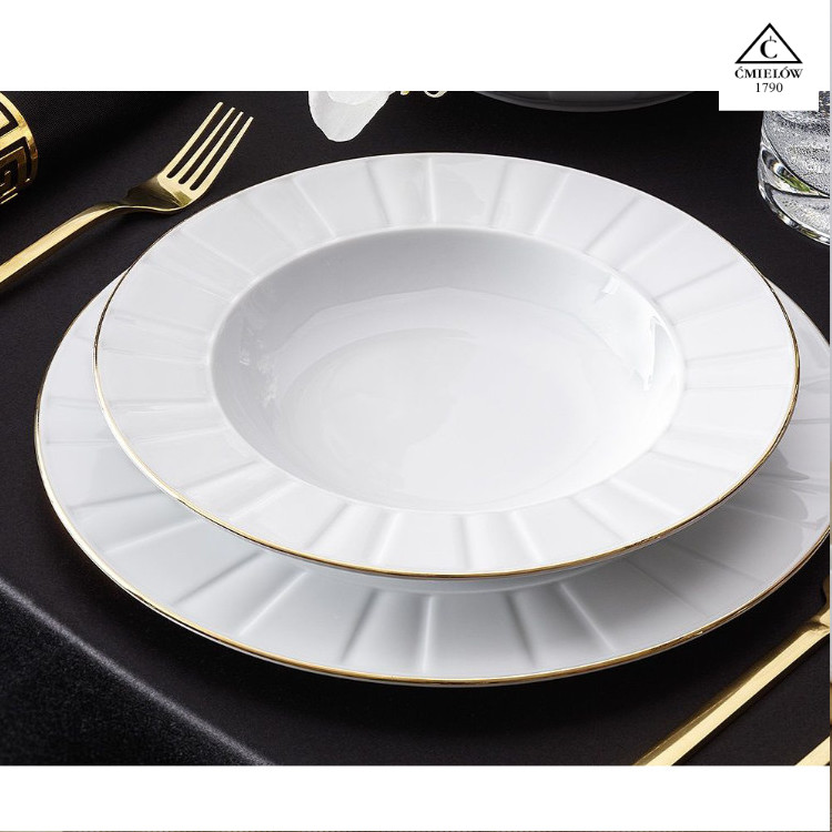 Servis za jelo "Oktawa" od 18 dijelova, proizvođača Ćmielów, izrađen je od kvalitetnog porculana i ukrašen elegantnim zlatnim rubom.