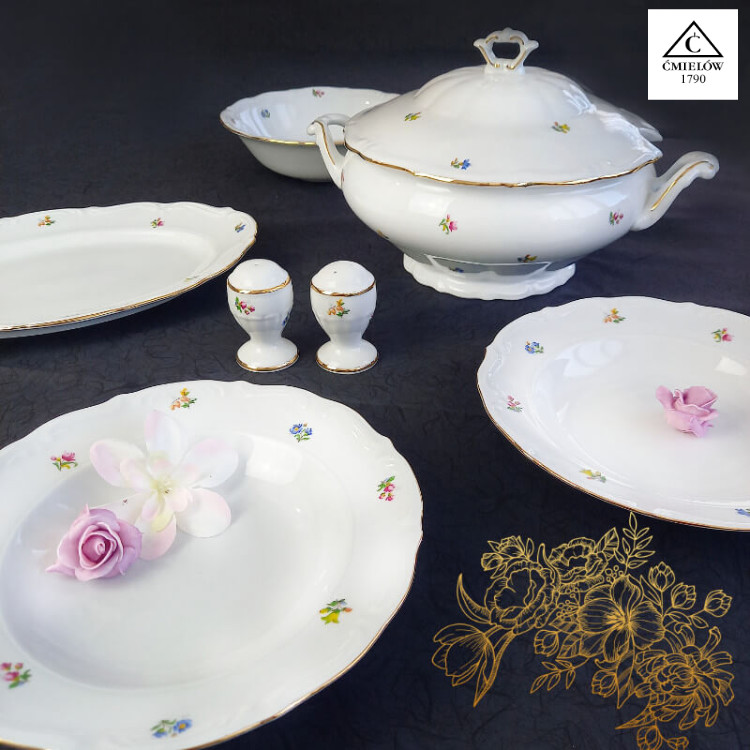 Vrhunski europski porculan - špajz servis s ukrasnim uzorkom i zlatnim rubom. Brand Cmielow nosi titulu superbrand od 2017. godine.
