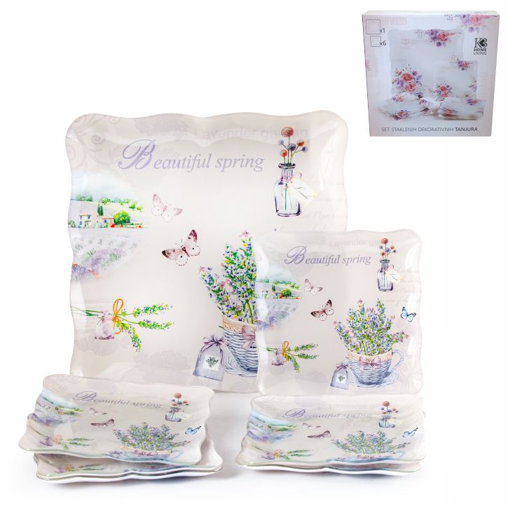 Stakleni set tanjura za kolače dekorativni 7 dijelni je prekrasan komplet koji će unijeti mirisnu atmosferu lavande na vaš stol prilikom posluživanja kolača i slastica.