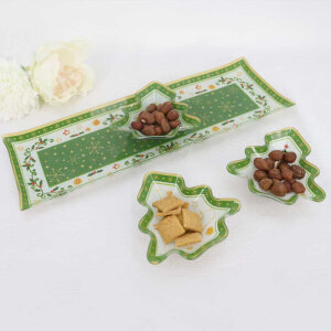 Set sadrži tri staklene zdjelice u obliku božićnog drvca, dimenzije 10 cm, savršene za serviranje raznih delicija – od orašastih plodova, umaka, pa sve do sitnih kolača.