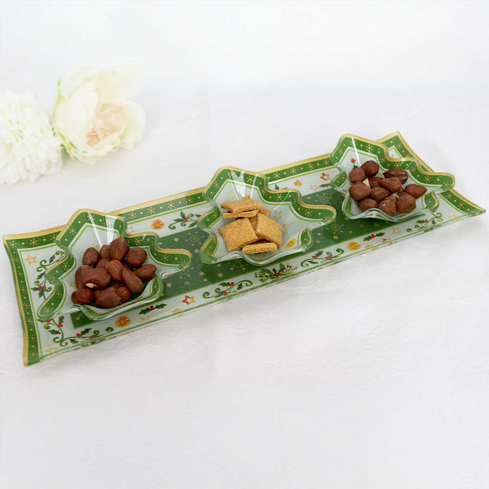 Stakleni dekorativni set s 3 zdjelice na tacni božićni motiv savršen je spoj elegancije i funkcionalnosti, idealan za vašu blagdansku trpezu ili svakodnevno serviranje s dodirom luksuza.