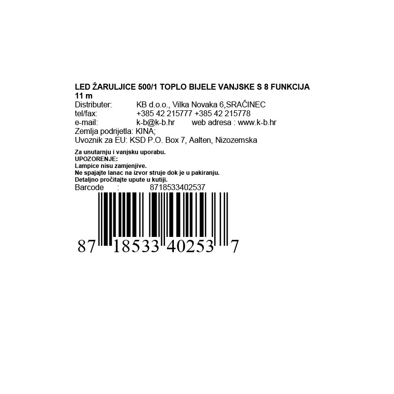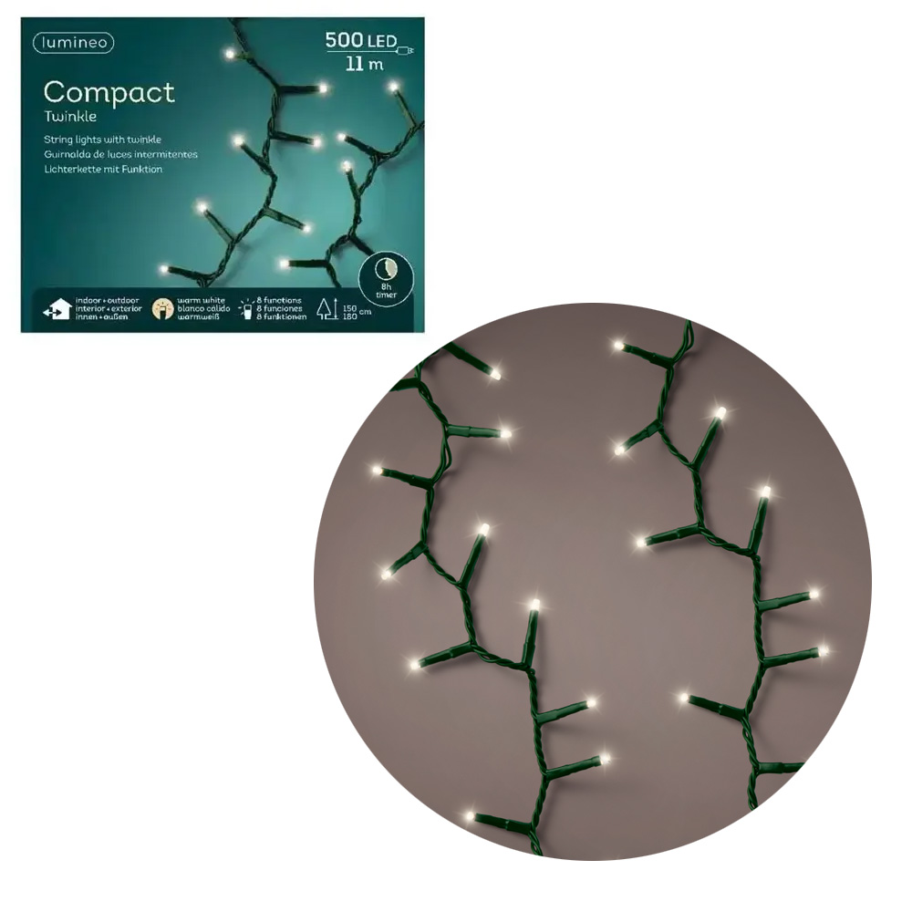 S 500 žaruljica u toploj bijeloj boji i duljinom od 11 metara, ovaj niz ne samo da stvara čarobnu atmosferu, već dolazi i s 8 različitih funkcija osvjetljenja, omogućujući vam da prilagodite ambijent prema svom raspoloženju ili prigodi.