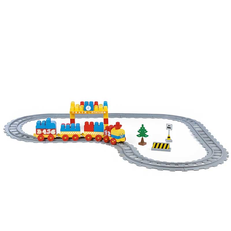 Set šarenih kocki - vlak s tračnicama je kreativni komplet za igru koji uključuje razne elemente za izgradnju željezničke pruge i okruženja.